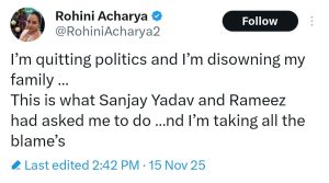 “मैं राजनीति छोड़ रही हूं और अपने परिवार से भी नाता तोड़ रही हूं। यह वही बात है जो संजय यादव और रमीज़ ने मुझसे कहने को कहा था। राजद की हार की पूरी जिम्मेदारी मैं लेती हूं।”